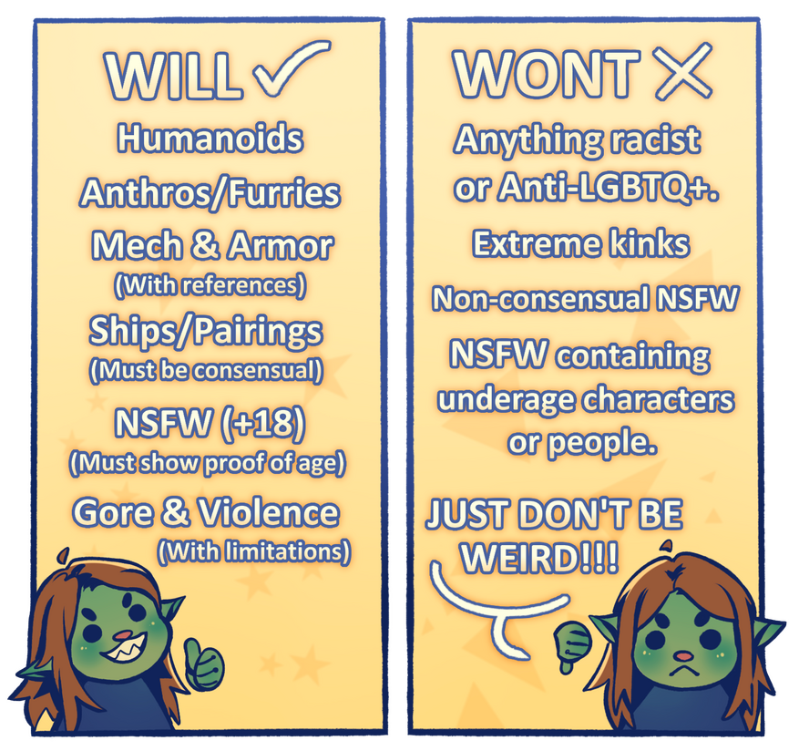 -If you can't find what you're looking for on the list, don't be afraid to ask. Listing every type of art style or niche I will or won't do would take up the whole page.Customer terms